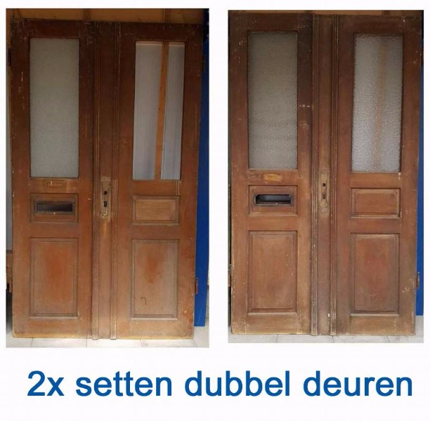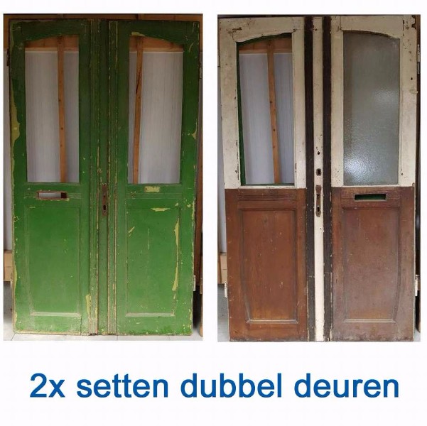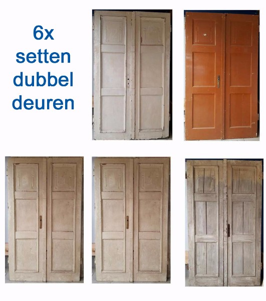Richtige alter Doppeltüren um 1900. Es sind Sets Türen mit Füllung. Der set von 6 hat auch Jugendstil Holzschnitzerei in Oben Füllung und die sets von 2 haben Glas.